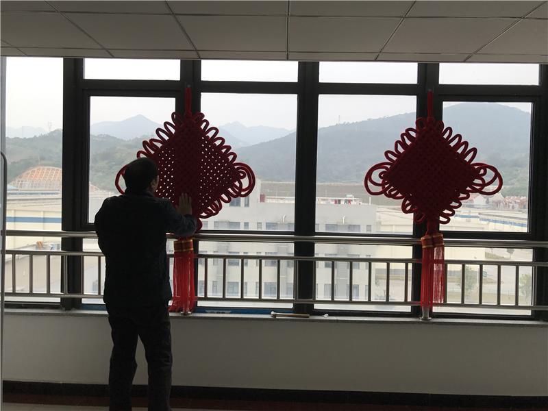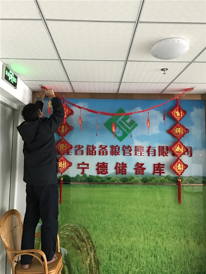 在送祝福的同時,寧德庫員工如火如荼的開展?fàn)I造“迎新春”活動。一是對庫區(qū)衛(wèi)生進行大清潔,用高壓水槍徹底清洗去因進倉沉積在倉外四周的灰塵,讓庫區(qū)環(huán)境以整潔,干凈、有序的新面貌迎接新的一年。二是布置裝飾辦公樓,在一樓大廳前懸掛紅燈籠,粘貼春聯(lián),LED滾動屏設(shè)置“歡度春節(jié)”字幕,營造春節(jié)喜慶氛圍。辦公樓懸掛中國結(jié),粘貼“?!辟N,寓意寧德庫像中國結(jié)一樣團結(jié)美滿,吉祥如意。