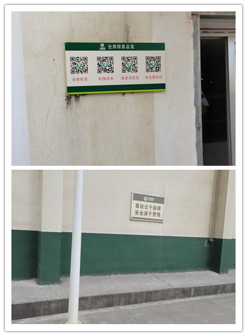 隨后大家在會(huì)議室面對(duì)面進(jìn)行科保技術(shù)交流,針對(duì)儲(chǔ)糧所面臨控溫、局部發(fā)熱等常見問(wèn)題進(jìn)行經(jīng)驗(yàn)分享,來(lái)到1號(hào)大豆倉(cāng)和5號(hào)小麥倉(cāng)實(shí)地參觀:兩座倉(cāng)均安裝糧倉(cāng)專用空調(diào),在空調(diào)上粘一個(gè)繩子來(lái)判斷空調(diào)風(fēng)是否有反轉(zhuǎn)運(yùn)行;針對(duì)局部非害蟲引起的高溫點(diǎn)采用降溫措施,使用是一種新型單管風(fēng)機(jī),效果明顯,體積輕操作方便,又能減輕保管員的工作強(qiáng)度;倉(cāng)內(nèi)的電氣設(shè)備下方布設(shè)防火毯;倉(cāng)房門口掛著四個(gè)二維碼分別是倉(cāng)房信息、科保信息、保管員信息、安全責(zé)任區(qū)信息;在熏蒸倉(cāng)外20米處布設(shè)移動(dòng)式插桿設(shè)置警戒線。