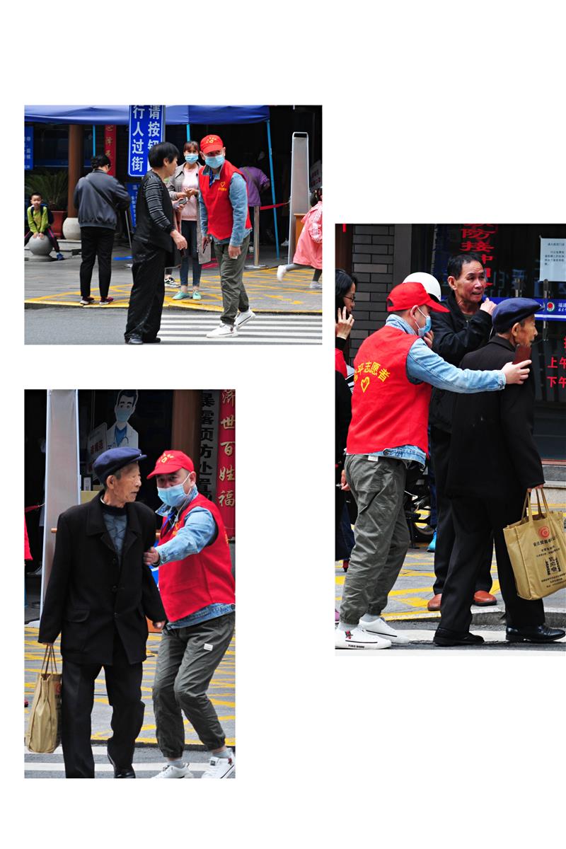 4月17日上午9:00—11:00,我?guī)熘驹刚吲宕餍〖t帽、身穿紅馬甲,精神抖擻地站在人流如織的人民醫(yī)院與商業(yè)城路口,引導(dǎo)行人遇紅燈站在等候區(qū)等待,不在斑馬線上停留、不闖紅燈,按指示燈通過斑馬線,非機(jī)動(dòng)車遇紅燈不超越停車線、不占斑馬線騎行;同時(shí)勸阻隨意闖紅燈橫穿斑馬線等不文明行為。在服務(wù)中,攙扶行動(dòng)不便的老人安全通過路口,并為路人指引方向與乘車路線,空余間隙主動(dòng)拾撿崗位周邊的煙頭垃圾,保持城市環(huán)境衛(wèi)生。