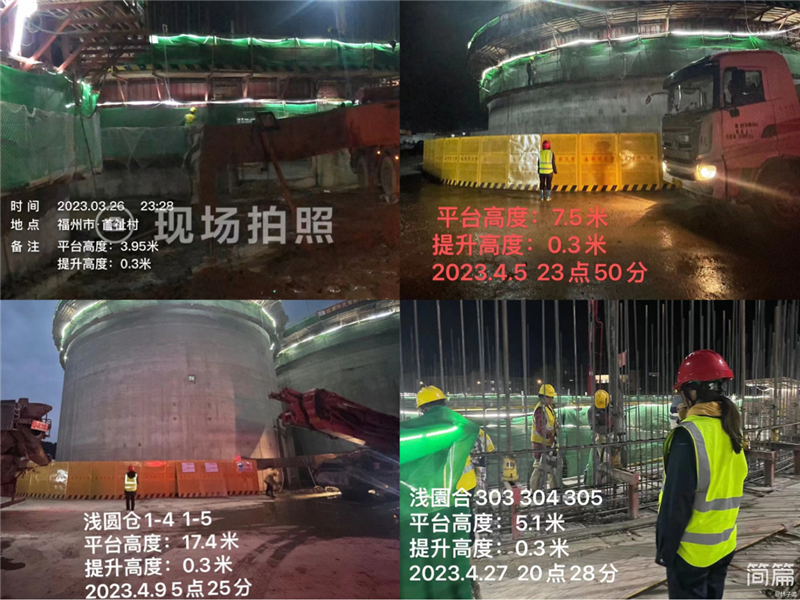 2023年3月初,人員進場并開始組裝滑模設(shè)備,于3月17日正式開始淺圓倉2-4、2-5的滑模施工。截至5月13日,完成了15座淺圓倉的滑模施工,歷時58天,比原定計劃提前11天完成了滑模施工任務(wù)。