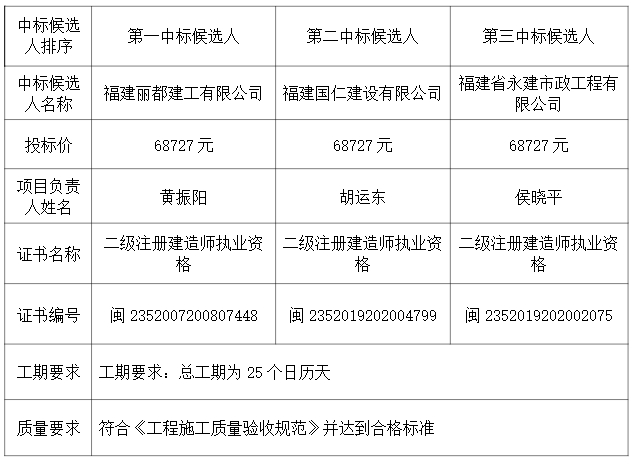 福建省儲(chǔ)備糧管理有限公司晉江直屬庫(kù)宿舍樓增補(bǔ)消防安全項(xiàng)目工程招標(biāo)于 2023年10月31日在福建省申富項(xiàng)目管理有限公司(泉州市經(jīng)濟(jì)開(kāi)發(fā)區(qū)德泰路328號(hào)萬(wàn)興大廈501室)開(kāi)標(biāo),已由評(píng)標(biāo)委員會(huì)評(píng)審?fù)戤?,現(xiàn)將中標(biāo)候選人結(jié)果公示如下: