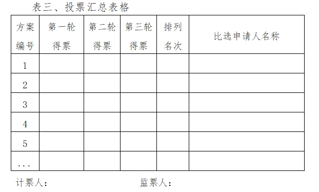 4.1.5最后一輪得票數(shù)最多的為優(yōu)先排序,若得票數(shù)相同,則以上一輪得票數(shù)多的為優(yōu)先排序,評委會依得票排序,推薦成交候選人。具體投票方法見表一、表二和表三。
