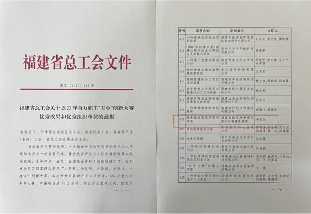 南安直屬庫(kù)《糧食振動(dòng)篩篩網(wǎng)提升改造》項(xiàng)目榮獲2023年福建省百萬(wàn)職工“五小” 創(chuàng)新大賽優(yōu)秀成果三等獎(jiǎng)