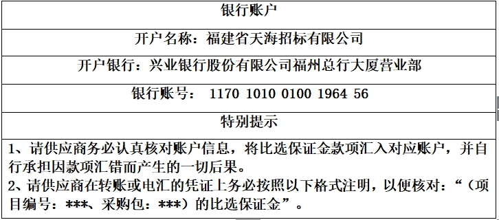 7、響應截止時間:響應文件應于 2024年 1 月 15 日 14 時 30 分(北京時間)。前按下述地址以書面形式送至福州市鼓樓區(qū)營跡路69號恒力創(chuàng)富中心西塔8層,由福建省天海招標有限公司接收,逾期收到的或不符合規(guī)定的響應文件將被拒絕。