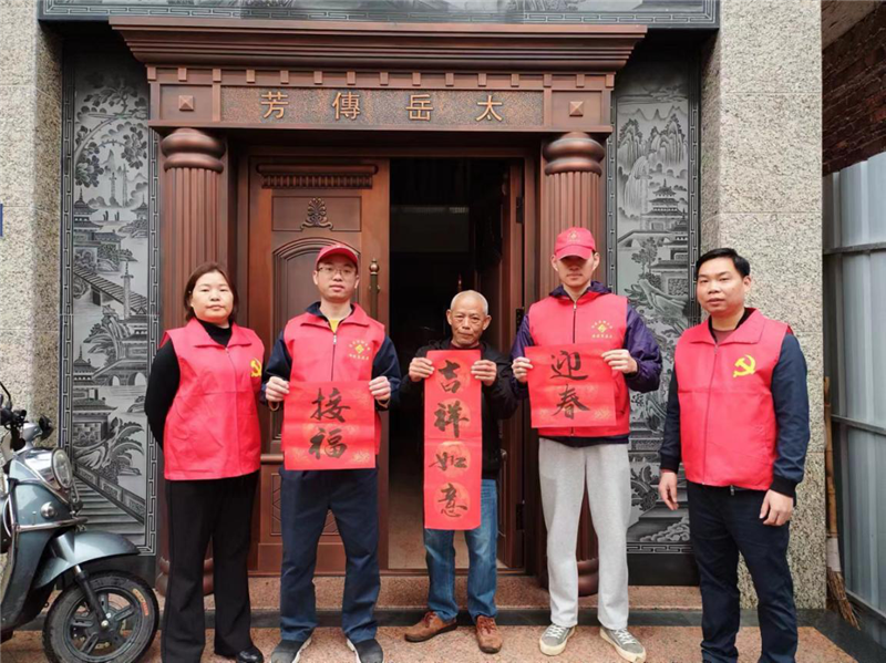活動(dòng)現(xiàn)場(chǎng),安溪直屬庫(kù)支部6名志愿者早早的在村委大樓前搭起了臺(tái)子,他們中有倒磨的、有遞紙的、有維持現(xiàn)場(chǎng)秩序的,在嚴(yán)冬歲末為大家?guī)砹诵履昱淖T?。前來領(lǐng)取春聯(lián)的群眾絡(luò)繹不絕,捧著這些油墨未干、字跡飄香的春聯(lián),個(gè)個(gè)喜上眉梢。一位老人家感慨的地說,現(xiàn)在的社會(huì)真好呀,在家門口就能領(lǐng)到春聯(lián),這帶有濃郁墨香味的春聯(lián),使年味更濃啦!