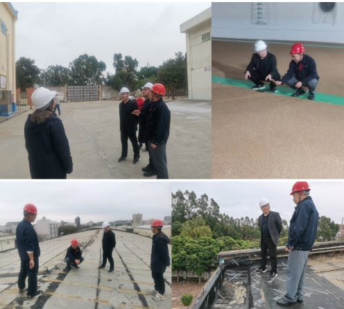 黃小勇董事長一行先后到1號倉、倉房屋頂?shù)鹊夭榭矗敿毩私饧Z食儲存、標(biāo)桿庫建設(shè)進展及臺風(fēng)后修復(fù)情況,深入了解晉江直屬庫倉房及糧食儲藏情況,并查看因臺風(fēng)導(dǎo)致屋面菱鎂板破損后的施工修復(fù)情況,王清記主任做了詳細匯報。