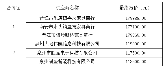合同包1:晉江市池店鎮(zhèn)喜來家具商行、南安市水頭鎮(zhèn)盈發(fā)家具商行、晉江市梅嶺新達家具商行;