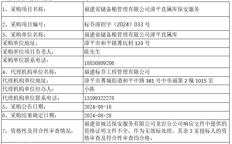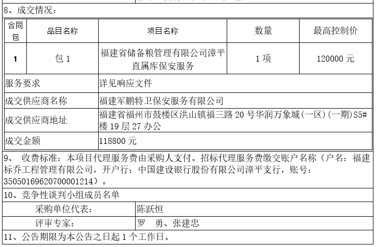 福建省儲備糧管理有限公司漳平直屬庫保安服務成交結果公告