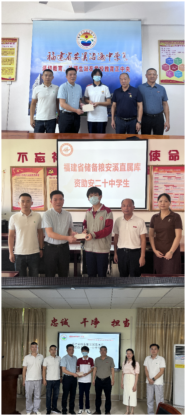 為弘揚(yáng)新時(shí)代文明風(fēng)尚,助力家境困難學(xué)生完成學(xué)業(yè)逐夢(mèng)前行,9月11日,安溪直屬庫(kù)黨支部組織志愿者前往安溪第二十中學(xué)、安溪沼濤中學(xué)、安溪第十一中學(xué),開(kāi)展“金秋助學(xué) 筑夢(mèng)前行”志愿服務(wù)活動(dòng),為3名家境困難的學(xué)生送去助學(xué)金。
