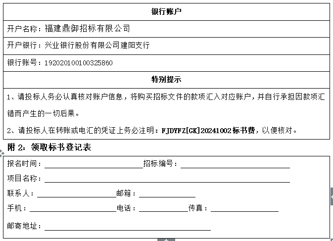 凡有意參加投標者,請于2024 年10月17日至 2024 年10月23日(法定公休日、法定節(jié)假日除外),每天上午9時30分至11時30分,下午3時00分至5時00分(北京時間,下同):①至福建鼎御招標有限公司【福建省福州市鼓樓區(qū)五四路19號國泰大廈六樓B區(qū)】購買招標文件,或②將購買招標文件款匯到本公司賬戶詳見(附1),同時將電匯底單復印件及領取招標文件登記表(格式詳見附2)寫明后將掃描件發(fā)至(2539135645@fjdyzb.com),未及時將《領取招標文件登記表》發(fā)送至本招標代理公司,引起的一切后果由投標人自行承擔。本招標代理公司不對郵寄過程中可能發(fā)生的延誤或丟失負責。