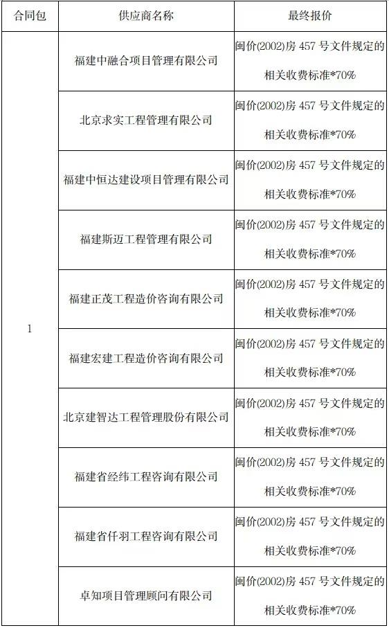 經(jīng)評標小組成員對各供應商響應文件進行資格性和符合性審查,經(jīng)審核,上述21家供應商均通過資格性審查。參加符合性審查的供應商共21家,其中5家供應商符合性審查不合格(北京建智達工程管理股份有限公司、福建省經(jīng)緯工程咨詢有限公司、卓知項目管理顧問有限公司、福建朱雀工程咨詢有限公司、泉州聯(lián)審工程造價咨詢有限公司提供的響應文件不滿足征集文件“第五章采購內(nèi)容及要求-二、技術和服務要求中3、★人員配置要求”的要求,符合性審查不合格,為無效響應。),其他16家供應商符合性審查均合格。符合性審查合格的供應商進入下一階段評審。根據(jù)征集文件“評審的標準和方法”的規(guī)定采用綜合評分法,入圍上限為5家,評審小組評議的入圍供應商結果如下:福建正茂工程造價咨詢有限公司、福建省仟羽工程咨詢有限公司、福建宏建工程造價咨詢有限公司、福州閩川工程咨詢有限公司、廈門中達利工程管理有限公司。