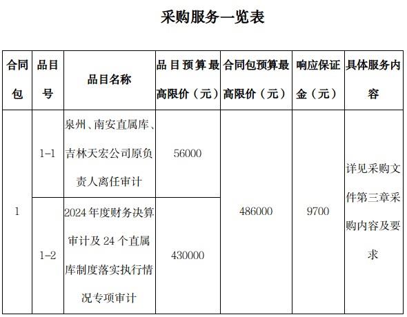 離任審計(jì)和2024年度財(cái)務(wù)決算審計(jì)及24個直屬庫制度落實(shí)執(zhí)行情況專項(xiàng)審計(jì)項(xiàng)目(第三次比選)公開比選公告