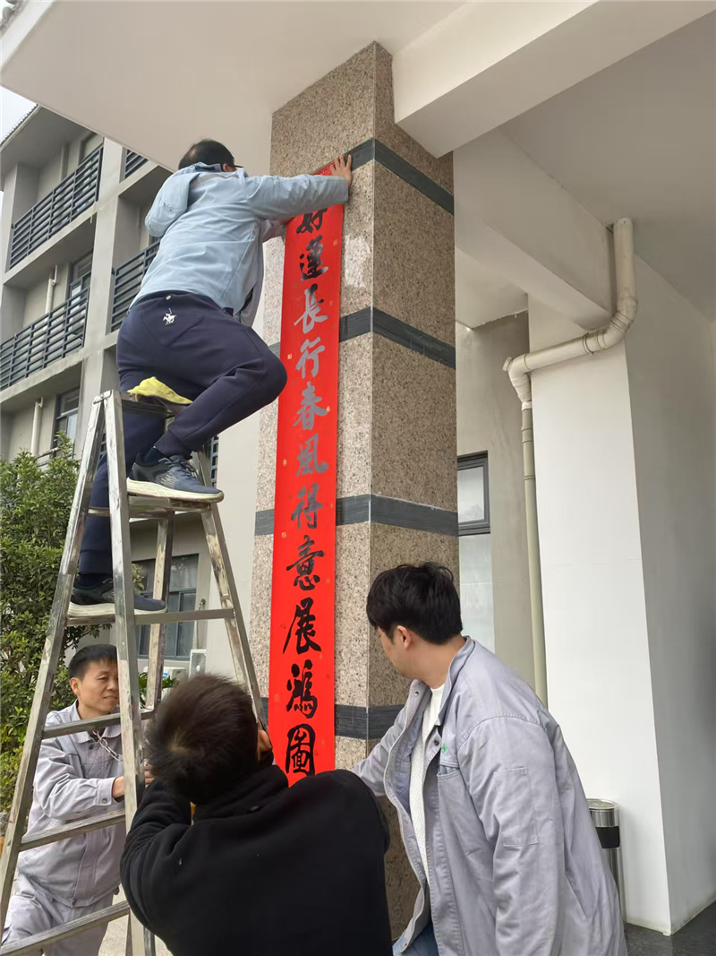 大家或手執(zhí)春聯(lián),細(xì)心比對(duì),將吉祥的話語(yǔ)貼于門(mén)楣,寄托著對(duì)新年的美好祈愿;或高舉燈籠,輕盈懸掛,讓火紅的希望照亮庫(kù)區(qū)的每一個(gè)角落,映襯出節(jié)日的喜慶與祥和;或穩(wěn)扶梯子,默默支撐,確保每一步都穩(wěn)健有力,為裝扮這方天地貢獻(xiàn)著自己的力量。當(dāng)嶄新和寓意著新年祝福的春聯(lián)貼于門(mén)楣,當(dāng)一串又一串紅火的燈籠掛上樹(shù)梢,當(dāng)寄托著大家新年愿望的中國(guó)結(jié)系在門(mén)前。就宛如紅綢彩帶迎風(fēng)飄揚(yáng),金色的光輝與忙碌的身影交織成了一幅幅動(dòng)人的畫(huà)卷,整個(gè)庫(kù)區(qū)洋溢著濃厚的節(jié)日氛圍。