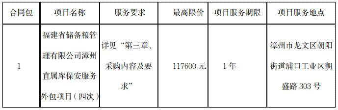 2.項目概況:為福建省儲備糧管理有限公司漳州直屬庫保安服務(wù)外包項目(四次)。