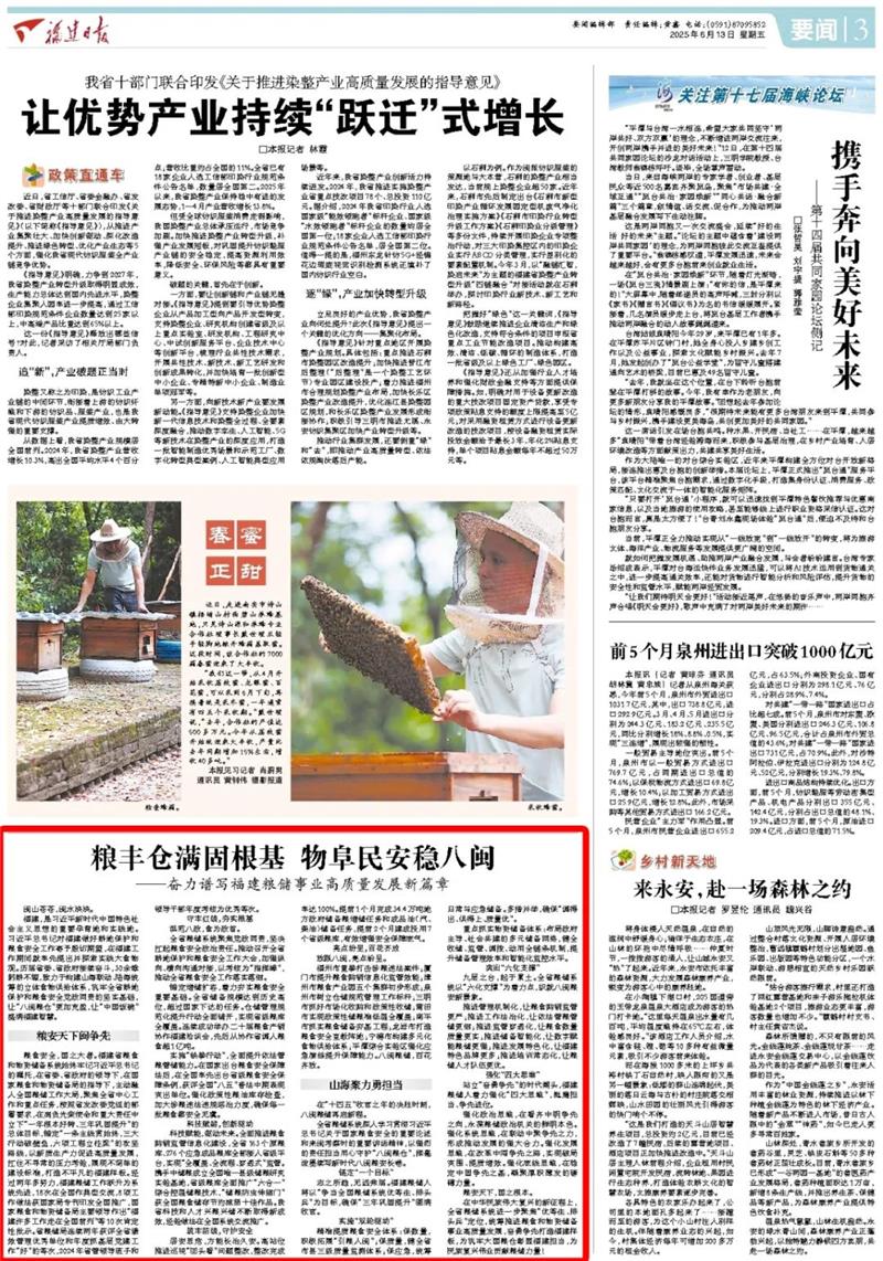 6月13日,福建日報3版刊發(fā)《糧豐倉滿固根基 物阜民安穩(wěn)八閩——奮力譜寫福建糧儲事業(yè)高質量發(fā)展新篇章》