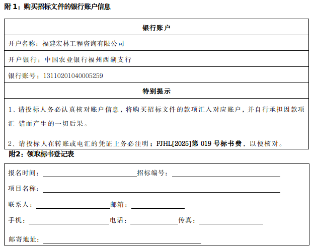4.1. 凡有意參加投標(biāo)者,請于2025年9月22日9時00分至2025年9月 27 日17時00分,將購買招標(biāo)文件款匯到本公司賬戶詳見(附1),同時將電匯底單復(fù)印件及領(lǐng)取招標(biāo)文件登記表(格式詳見附2)寫明后將掃描件發(fā)至(fjhlgczx@163.com),未及時將《領(lǐng)取招標(biāo)文件登記表》發(fā)送至本招標(biāo)代理公司,引起的一切后果由投標(biāo)人自行承擔(dān)。