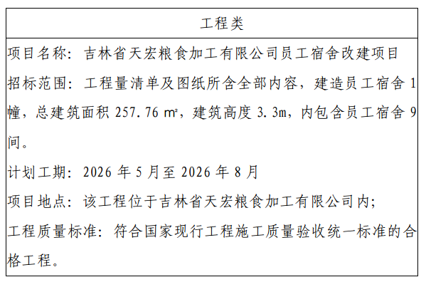 一、項(xiàng)目名稱:吉林省天宏糧食加工有限公司員工宿舍改建項(xiàng)目