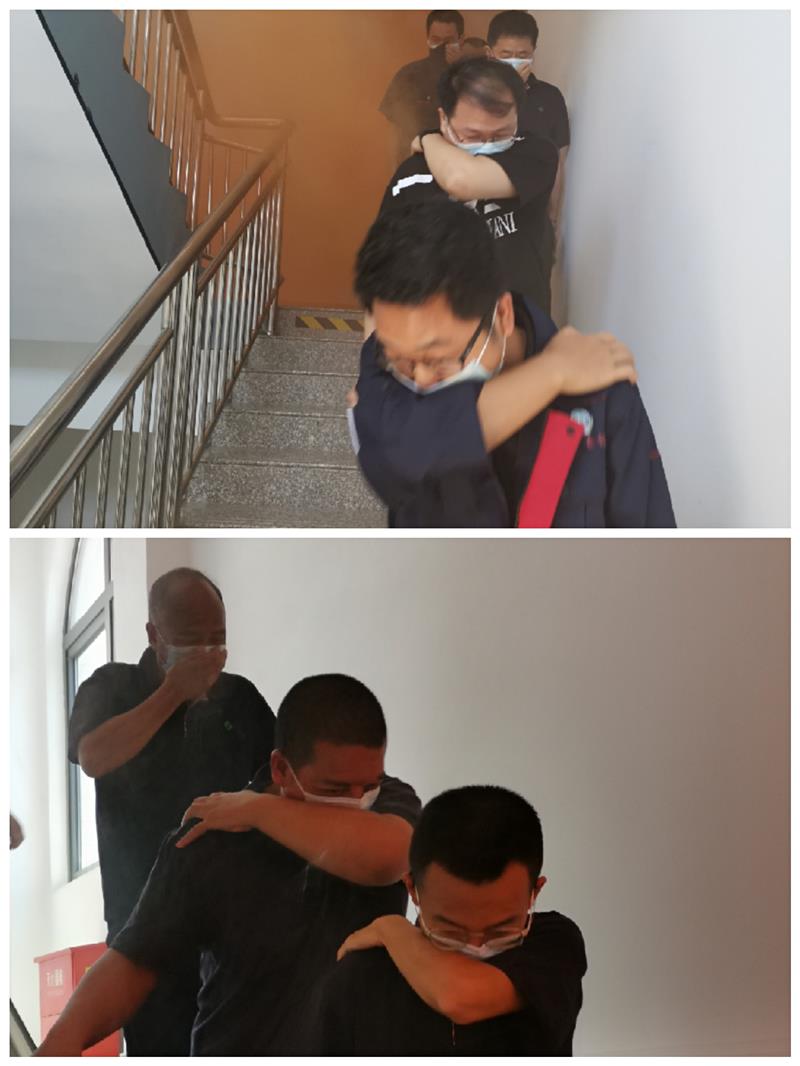 火災警報響起后,疏散警戒組引導綜合辦公樓全體工作人員從安全通道緊張有序向廣場疏散,撤離完畢后由疏散警戒組組長向指揮部報告火場疏散情況,總指揮根據(jù)“先救人后救火”原則下達火場搜救(滅火)指令。