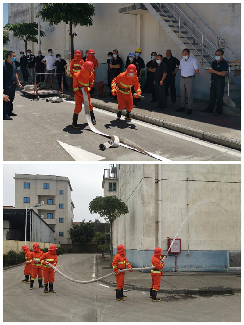 模擬25號倉庫(糧食)著火,安全技術專家現(xiàn)場指導消防水帶甩帶、連接及盤卷訓練,訓練后搶險救災組成員均能在14秒內完成水帶連接及出水。