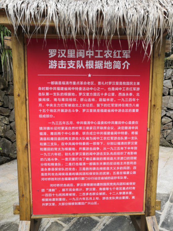羅漢里閩中游擊支隊根據(jù)地是閩中游擊區(qū)南方8省15個游擊區(qū)之一,一都鎮(zhèn)羅漢里游擊根據(jù)地,是南方三年游擊戰(zhàn)閩中戰(zhàn)區(qū)重要組成部分,福州戰(zhàn)區(qū)的核心就在這里。羅漢里方圓50多公里,西連永泰,北接閩侯,南與莆田相鄰,群山連綿,路隘林密。1934年10月,中央主力紅軍被迫北上長征后,羅漢里就作為(1935-1936年)中共福建省閩中特委和閩中工農(nóng)紅軍游擊隊第一大隊活動中心和根據(jù)地。