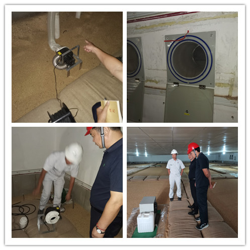 隨后大家在會(huì)議室面對(duì)面進(jìn)行科保技術(shù)交流,針對(duì)儲(chǔ)糧所面臨控溫、局部發(fā)熱等常見問(wèn)題進(jìn)行經(jīng)驗(yàn)分享,來(lái)到1號(hào)大豆倉(cāng)和5號(hào)小麥倉(cāng)實(shí)地參觀:兩座倉(cāng)均安裝糧倉(cāng)專用空調(diào),在空調(diào)上粘一個(gè)繩子來(lái)判斷空調(diào)風(fēng)是否有反轉(zhuǎn)運(yùn)行;針對(duì)局部非害蟲引起的高溫點(diǎn)采用降溫措施,使用是一種新型單管風(fēng)機(jī),效果明顯,體積輕操作方便,又能減輕保管員的工作強(qiáng)度;倉(cāng)內(nèi)的電氣設(shè)備下方布設(shè)防火毯;倉(cāng)房門口掛著四個(gè)二維碼分別是倉(cāng)房信息、科保信息、保管員信息、安全責(zé)任區(qū)信息;在熏蒸倉(cāng)外20米處布設(shè)移動(dòng)式插桿設(shè)置警戒線。