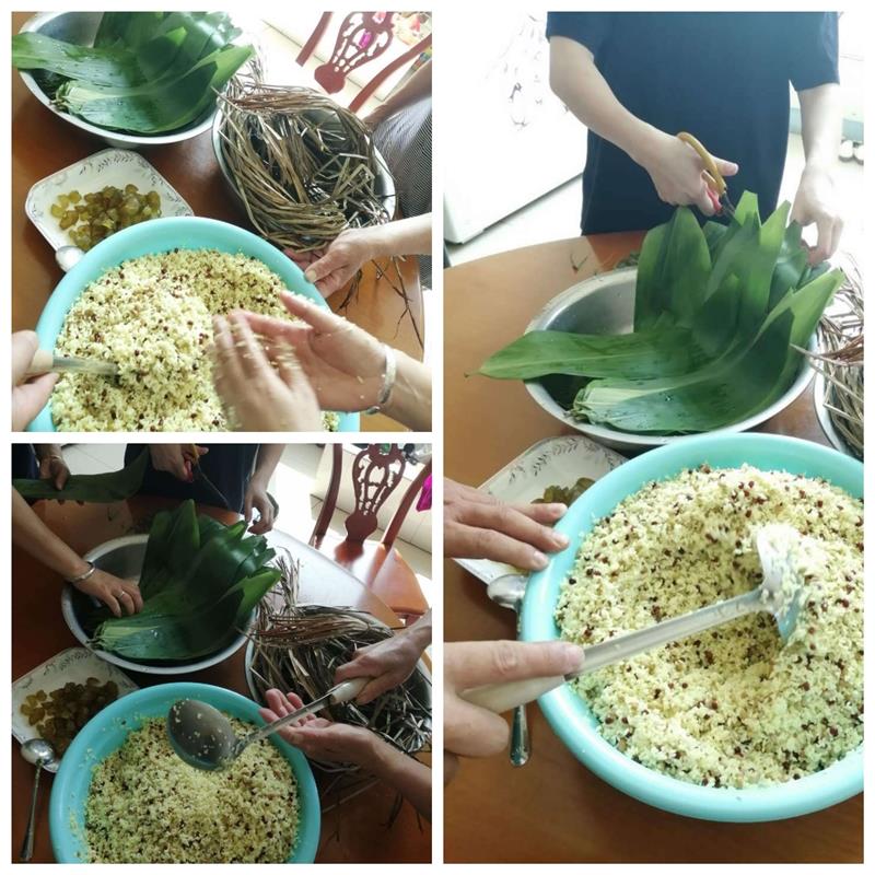 在準備好了糯米、粽葉、五花肉、花生、豆子等材料,大家圍在一起包粽子。折粽葉、裝米、放五花肉、定型、纏線……碧綠的粽葉在手中翻飛,技術嫻熟的不用一分鐘就可以包好一個粽子,而現(xiàn)學的則相對手拙,包的粽子屢屢出現(xiàn)漏米的情況……盡管大家的包粽子技術參差不齊,但歡聲笑語不斷,各式各樣的粽子在手中誕生了,享受著包粽子的過程。