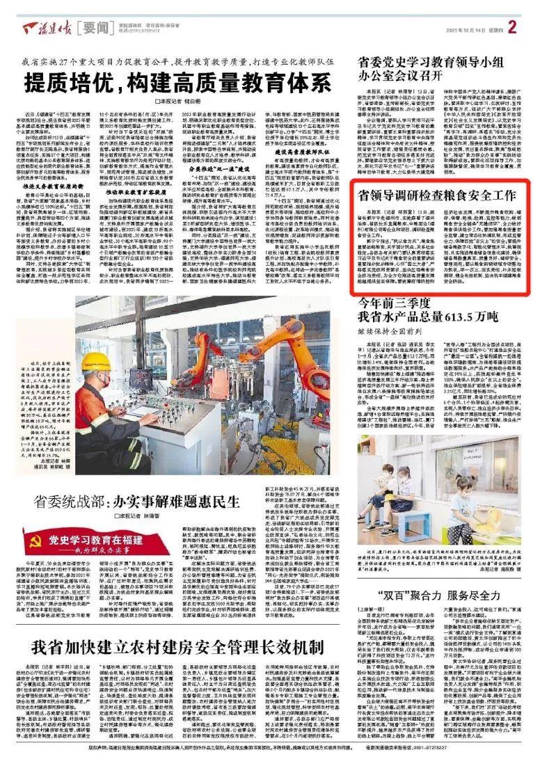 10月14日,福建日?qǐng)?bào)在要聞02版刊登了《省領(lǐng)導(dǎo)調(diào)研檢查糧食安全工作》文章。具體請(qǐng)看詳細(xì)報(bào)道。
