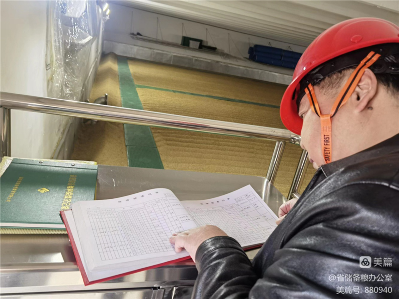隨后,在中控室,劉惠標總經(jīng)理現(xiàn)場調(diào)取監(jiān)控視頻,查看了各倉糧溫情況,并深入35號稻谷倉,聽取保管員候查報告,進入倉內(nèi)實地檢查儲糧情況,查看糧情記錄簿、科保記錄簿和儲備糧??ǖ忍顚懬闆r,以及詢問我?guī)炜萍純Z應(yīng)用情況。