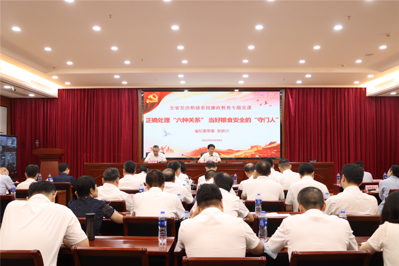 為深入開(kāi)展學(xué)習(xí)貫徹習(xí)近平新時(shí)代中國(guó)特色社會(huì)主義思想主題教育,持續(xù)深化糧食購(gòu)銷(xiāo)領(lǐng)域?qū)m?xiàng)整治,營(yíng)造風(fēng)清氣正的良好政治生態(tài),6月30日下午,省發(fā)改委、省糧儲(chǔ)局邀請(qǐng)省紀(jì)委常委張嬌興同志為全省發(fā)改糧儲(chǔ)系統(tǒng)上廉政教育專(zhuān)題黨課。省發(fā)改委黨組成員,省糧儲(chǔ)局黨組書(shū)記、局長(zhǎng)鐘昌華主持學(xué)習(xí)會(huì)。