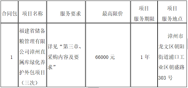 福建華昇工程項(xiàng)目管理有限公司受比選人福建省儲(chǔ)備糧管理有限公司漳州直屬庫(kù)委托,對(duì)福建省儲(chǔ)備糧管理有限公司漳州直屬庫(kù)綠化養(yǎng)護(hù)外包項(xiàng)目(三次)的下述服務(wù)進(jìn)行比選,現(xiàn)歡迎符合條件的單位前來參加?,F(xiàn)就有關(guān)事宜公告如下: