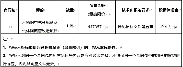 福建燕城招標(biāo)代理咨詢有限公司受福建省儲(chǔ)備糧管理有限公司永安直屬庫委托,采用公開招標(biāo)方式組織不銹鋼空氣分配箱及氣體回流管改造項(xiàng)目的招標(biāo)活動(dòng),現(xiàn)歡迎合格的投標(biāo)人參加投標(biāo)。