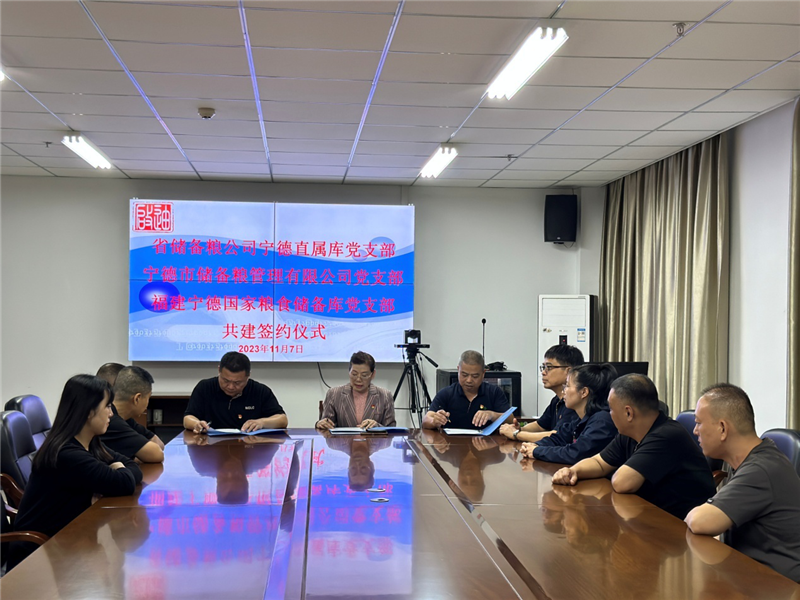 為深入貫徹習近平新時代中國特色社會主義思想,進一步探索創(chuàng)新黨建工作,全面開展基層黨組織結(jié)對共建活動,著力構(gòu)建基層黨建工作新格局,實現(xiàn)三級庫黨建工作與業(yè)務(wù)工作“雙提升”,牢固樹立“以黨建促業(yè)務(wù),以業(yè)務(wù)強黨建”的工作理念,促進黨建和業(yè)務(wù)深度融合互促。福建省儲備糧管理有限公司寧德直屬庫、寧德市儲備糧管理有限公司、福建寧德國家糧食儲備庫三家黨支部于2023年11月7日簽訂黨建共建協(xié)議書。