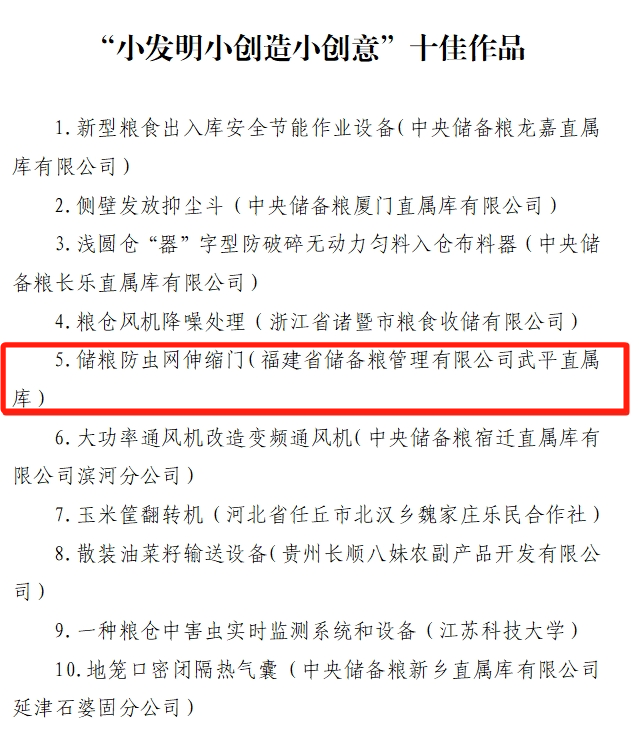全國糧儲“小發(fā)明小創(chuàng)造小創(chuàng)意”評選結(jié)果公布!省儲備糧公司武平直屬庫入選“十佳作品”