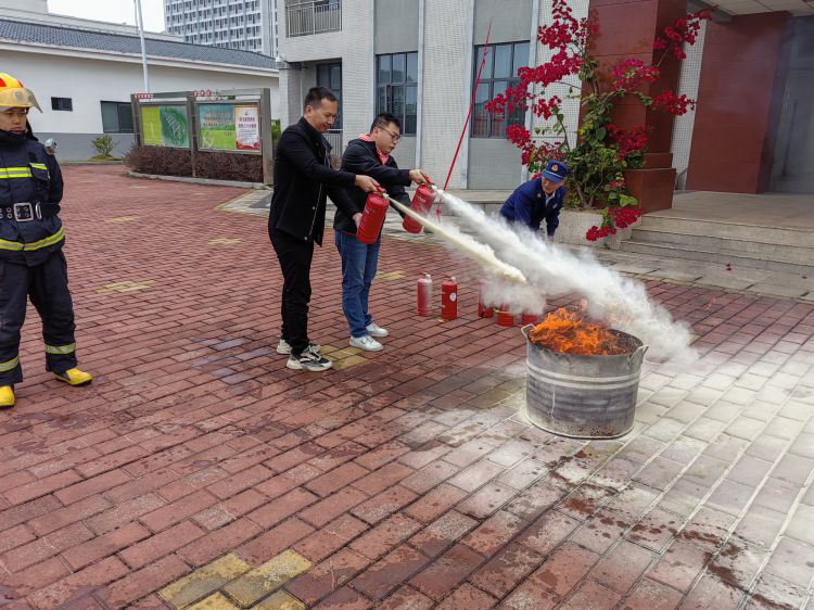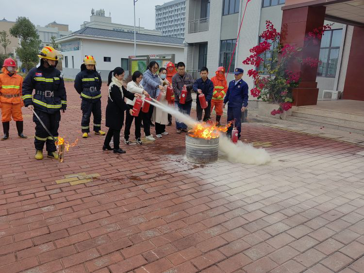 模擬火災(zāi)現(xiàn)場進(jìn)行滅火應(yīng)急演練,參演人員輪流演練滅火器和消防水帶的使用。