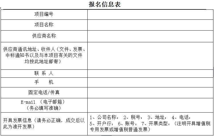 4 采購文件的獲取 有意參加比選的單位,請(qǐng)于2023年12月19日至2023年12月23日將報(bào)名費(fèi)300元(比選文件費(fèi)用)通過電匯或轉(zhuǎn)帳形式匯入比選公告中寫明的轉(zhuǎn)至招標(biāo)代理機(jī)構(gòu)賬戶(售后不退),并備注“FJBFZB(Z)2023-111” 資料費(fèi)-單位名稱”,同時(shí)將電匯或轉(zhuǎn)賬的銀行回單及填寫完整清晰的下述“報(bào)名信息表”蓋公章后發(fā)至招標(biāo)代理機(jī)構(gòu)郵箱 625249263@qq.com。招標(biāo)代理機(jī)構(gòu)收到后即將采購文件以電子郵件形式發(fā)給供應(yīng)商。