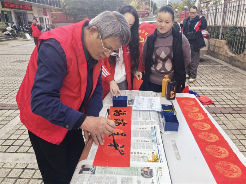 活動現(xiàn)場,志愿者們展紙蘸墨,把對新年的祝福寫進一行行俊秀蒼勁的書法中,把對新年的期盼寫進一句句墨香四溢的語句間,把對群眾的濃濃情意寫進一副副對聯(lián)里,讓大家過一個高高興興的年。