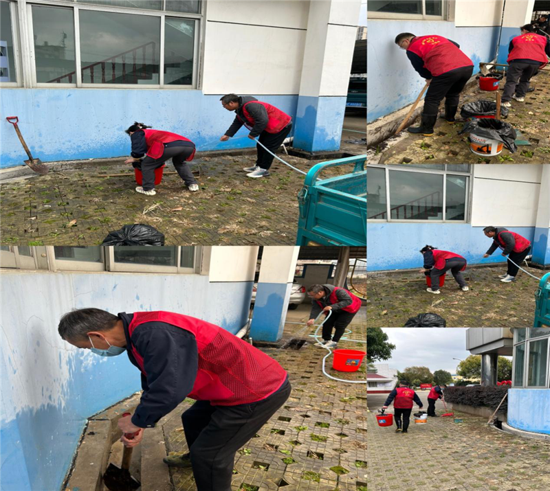 組織黨員對辦公樓周邊衛(wèi)生死角進行整治打掃。