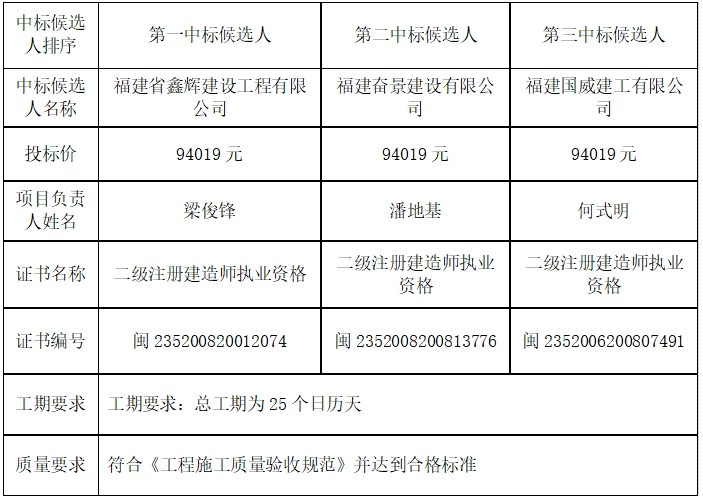 福建省儲備糧管理有限公司晉江直屬庫門廳改造工程招標(biāo)于 2024年04月08日在福建省申富項(xiàng)目管理有限公司(泉州市經(jīng)濟(jì)開發(fā)區(qū)德泰路328號萬興大廈501室)開標(biāo),已由評標(biāo)委員會評審?fù)戤?,現(xiàn)將中標(biāo)候選人結(jié)果公示如下: