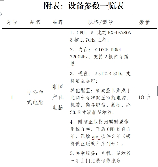 質(zhì)量要求:符合《設(shè)備參數(shù)一覽表》要求,售后服務(wù):主機、顯示器三年上門免費保修服務(wù)。