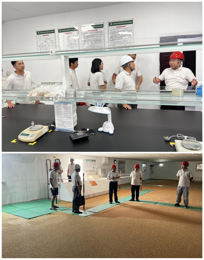 漳州直屬庫一行現(xiàn)場參觀了晉江庫檢化驗(yàn)室,并深入P12號倉進(jìn)行參觀交流,晉江直屬庫主任王清記詳細(xì)介紹了晉江庫的基本情況和日常管理經(jīng)驗(yàn),雙方就科學(xué)儲糧、節(jié)能降耗、倉儲設(shè)施功能提升改造等技術(shù)性問題展開討論。