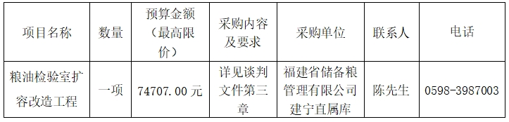 受福建省儲備糧管理有限公司建寧直屬庫委托,就糧油檢驗(yàn)室擴(kuò)容改造工程進(jìn)行競爭性談判,歡迎收到邀請函的供應(yīng)商響應(yīng)談判。