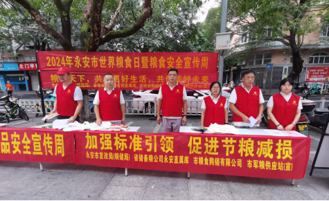 為全面貫徹黨的二十大和二十屆二中、三中全會(huì)精神,樹立和踐行大食物觀,深入貫徹實(shí)施糧食安全保障法,強(qiáng)化全社會(huì)對(duì)糧食安全形勢(shì)的認(rèn)識(shí),增強(qiáng)公民科學(xué)用糧意識(shí),推動(dòng)愛(ài)糧節(jié)糧行動(dòng)全面深入開展,10月15日下午,永安直屬庫(kù)與永安市發(fā)改局(糧儲(chǔ)局)、永安市糧食購(gòu)銷公司、永安市軍糧供應(yīng)站等單位在燕江樓廣場(chǎng)開展了以“糧安天下,共建更好生活,共創(chuàng)美好未來(lái)”為主題的2024年世界糧食日暨糧食安全宣傳周活動(dòng)。