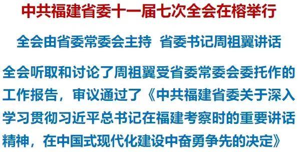 全會(huì)聽(tīng)取和討論了周祖翼受省委常委會(huì)委托作的工作報(bào)告,審議通過(guò)了《中共福建省委關(guān)于深入學(xué)習(xí)貫徹習(xí)近平總書(shū)記在福建考察時(shí)的重要講話精神,在中國(guó)式現(xiàn)代化建設(shè)中奮勇?tīng)?zhēng)先的決定》。周祖翼就《決定(討論稿)》向全會(huì)作了說(shuō)明。