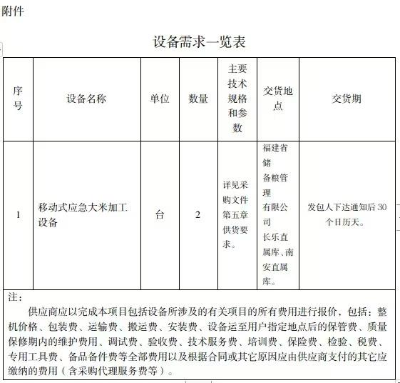 2.2 采購(gòu)范圍:移動(dòng)式應(yīng)急大米加工設(shè)備等采購(gòu)、制造、運(yùn)輸、保險(xiǎn)、卸貨、保管、安裝、空載和有載調(diào)試、功能擔(dān)保測(cè)試以及驗(yàn)收、按采購(gòu)文件有關(guān)要求進(jìn)行培訓(xùn)、技術(shù)服務(wù)以及在質(zhì)量保證期內(nèi)及期后進(jìn)行的所有服務(wù)。詳見(jiàn)附件《設(shè)備需求一覽表》。