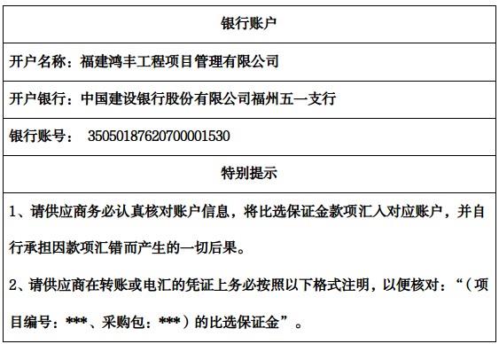 11、有關(guān)本項(xiàng)目的相關(guān)信息(包括采購文件若有修改補(bǔ)充),福建鴻豐工程項(xiàng)目管理有限公司將通過以下媒介發(fā)布通知,請潛在比選申請人隨時關(guān)注相關(guān)網(wǎng)站,以免錯漏重要信息。