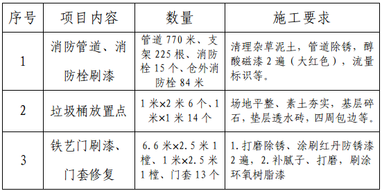 我?guī)煲騻}(cāng)儲(chǔ)管理工作的需要,擬對(duì)庫(kù)區(qū)消防管道等進(jìn)行刷漆、建設(shè)垃圾桶放置點(diǎn),現(xiàn)已具備采購(gòu)條件?,F(xiàn)將項(xiàng)目相關(guān)內(nèi)容公告如下: