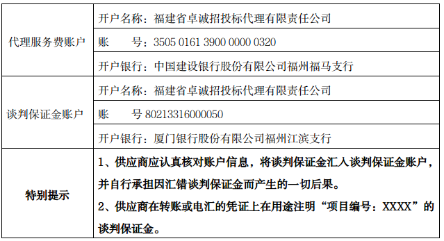 7.談判文件獲取方式:現(xiàn)場獲取或郵件獲取,若采用郵件獲取,請前往福建省卓誠招投標代理有限責任公司官網(wǎng)(www.fjzczb.com)首頁最底下辦事指南查看具體流程,未獲取談判文件或未填寫登記表的,響應文件將被拒絕。