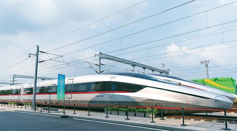 “十四五”時(shí)期,以CR450動(dòng)車組為代表的一項(xiàng)項(xiàng)重大技術(shù)裝備項(xiàng)目取得新進(jìn)展、實(shí)現(xiàn)新突破。CR450動(dòng)車組試驗(yàn)速度可達(dá)450公里/小時(shí),運(yùn)營速度可達(dá)400公里/小時(shí),是全球跑得最快的高鐵。圖為2025年7月9日,在國家鐵道試驗(yàn)中心展區(qū)拍攝的CR450BF動(dòng)車組。 新華社記者 才揚(yáng)/攝